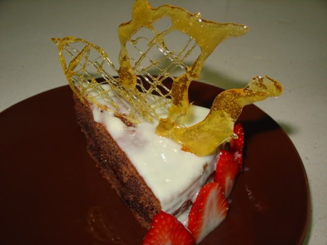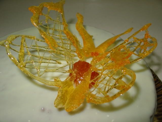 Por encima lleba una cobertura de chocolate blanco y un adorno de caramelo en foma de mariposa que nos enseño Temesmo de MR a hacer...