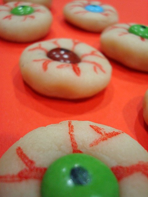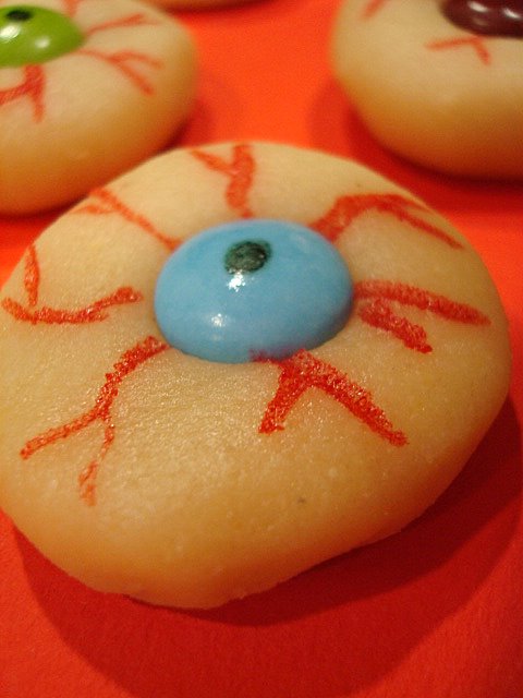 Outra ideia para as crianças é fazer estes olhos em bolachas, com uma receita de boalchinhas de manteiga e colocar depois (ou mesmos antes) os Smarties e fazer os raios com corantes...