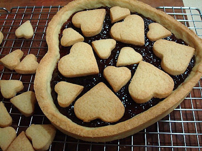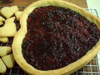 Hornear la masa de la tarta juntamente con los corazones cortados en horno precalentado a 180º hasta que estén cocidos, dejar enfriar encima a de una rejilla, rellenar la tarta con mermelada casera de fresas.